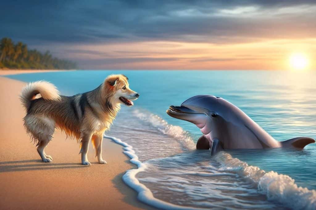 Dogs and dolphins might seem worlds apart, but their playful personalities often draw them together. In areas where dolphins come close to shore, dogs have been known to wade in to greet them, wagging tails and all. Dolphins, curious by nature, will approach the dogs, swimming close to the surface and sometimes even mimicking the dog’s movements. Their interactions are playful, showing a fascinating cross-species connection that highlights both animals’ social natures.