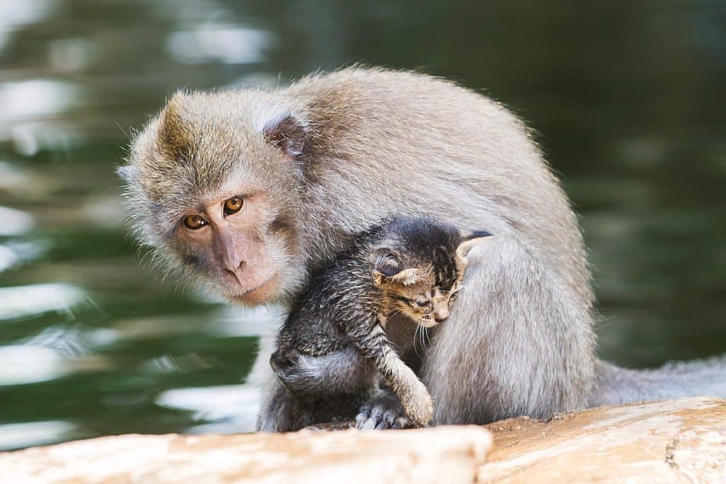 Monkeys are incredibly social, and in some cases, they have been known to adopt orphaned kittens as their own. In certain rescue centers and sanctuaries, monkeys and kittens are given the opportunity to play and interact. Monkeys treat these tiny friends with gentleness, often grooming and protecting them. This unusual friendship reveals the nurturing nature of primates and how animals can find comfort and companionship, even across species.