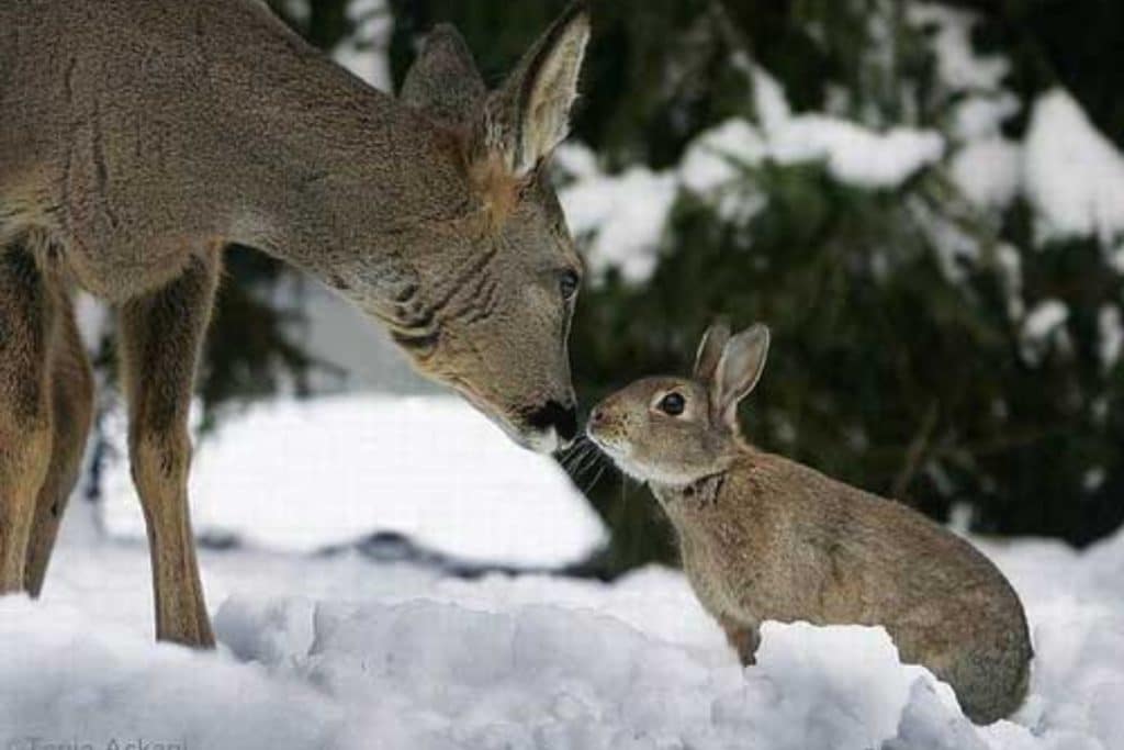 Rabbits and deer are both prey animals, but that doesn’t stop them from enjoying each other’s company. In forested areas, they’re often seen grazing or resting together, providing a sense of safety in numbers. Deer and rabbits seem to share a mutual understanding and occasionally even play together. These quiet friendships offer both animals a sense of companionship and security in an unpredictable world.