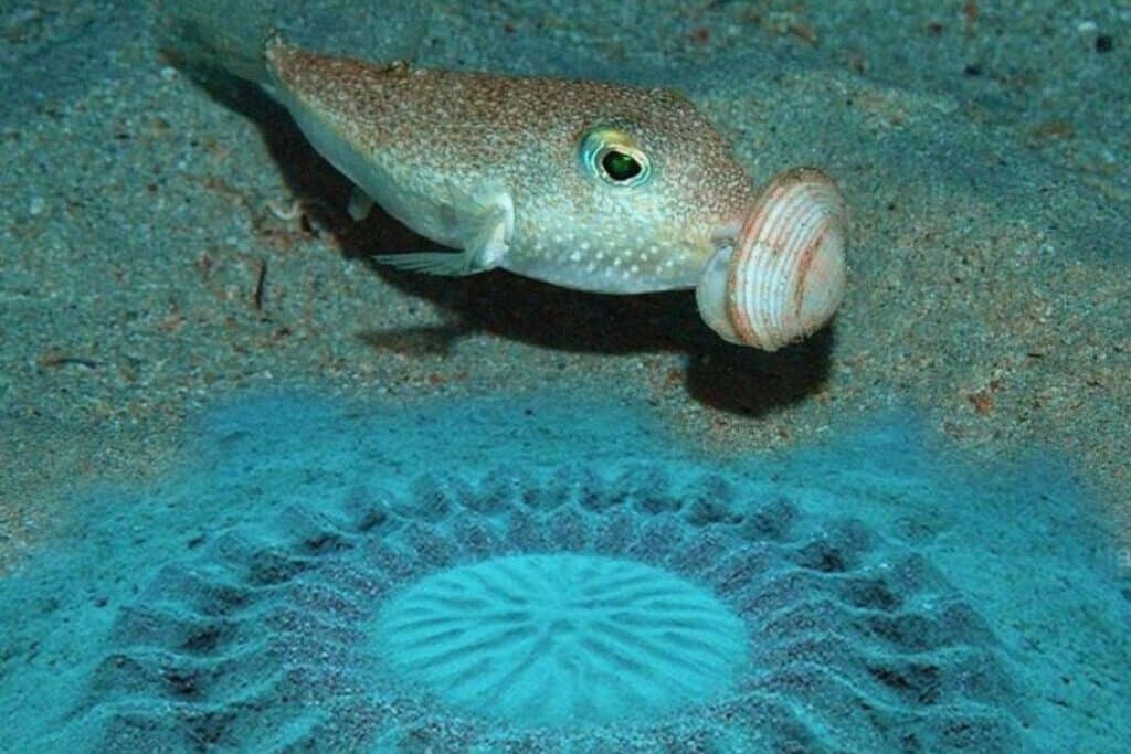 Male pufferfish in the ocean create stunning geometric patterns in the sand to attract mates. These intricate designs, sometimes up to six feet wide, are crafted using only their fins. A well-made pattern can entice a female, who inspects it closely before deciding to mate.