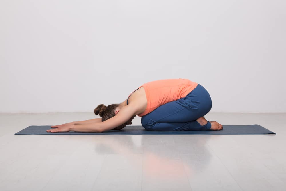 A resting pose that helps calm the mind and relieve tension. Kneel on the floor, touch your big toes together, and sit on your heels. Separate your knees and lay your torso down between your thighs.