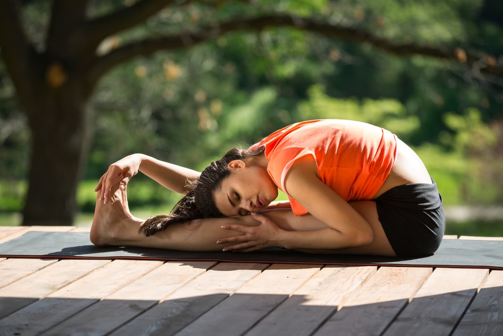 This pose helps relieve stress and stretch the spine and hamstrings. Sit on the floor with legs extended forward, inhale and raise your arms, and exhale as you bend forward from the hips over your legs.