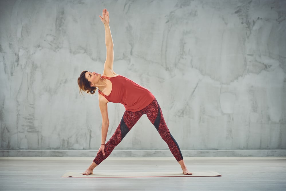 Triangle Pose stretches the legs, muscles around the knee, ankles, hips, groin, hamstrings, and spine. Stand with feet wide apart, extend your arms, and bend from the hip over your right leg, with your right hand reaching the ground and left hand up in the air.