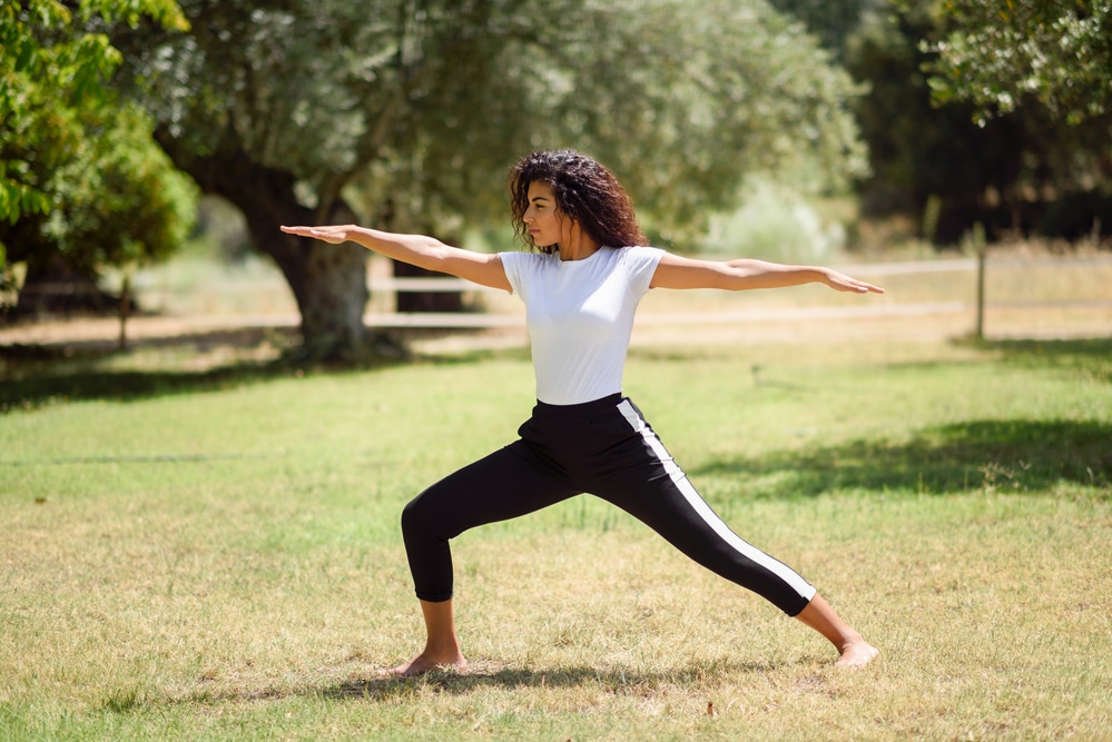 Warrior I is a standing pose that enhances focus, balance, and stability. Begin in a high lunge position, then drop your back heel and lift your arms up towards the sky, keeping your front knee bent and hips facing forward.