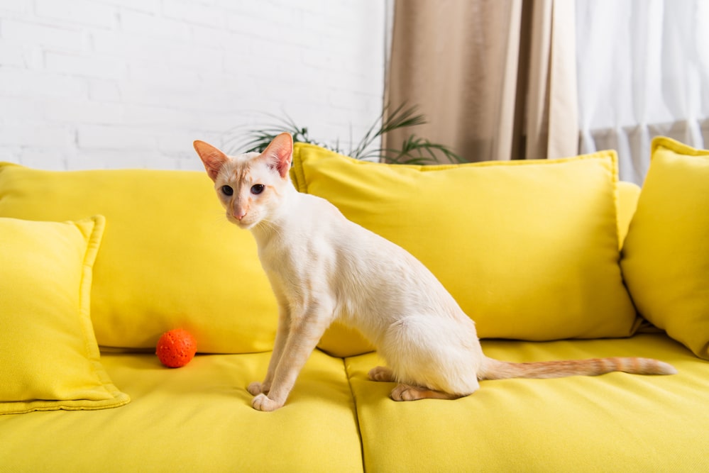 The Oriental Shorthair, related to the Siamese, is known for its long life, often living well into its teens. They are recognized for their slender bodies, large ears, and affectionate nature.