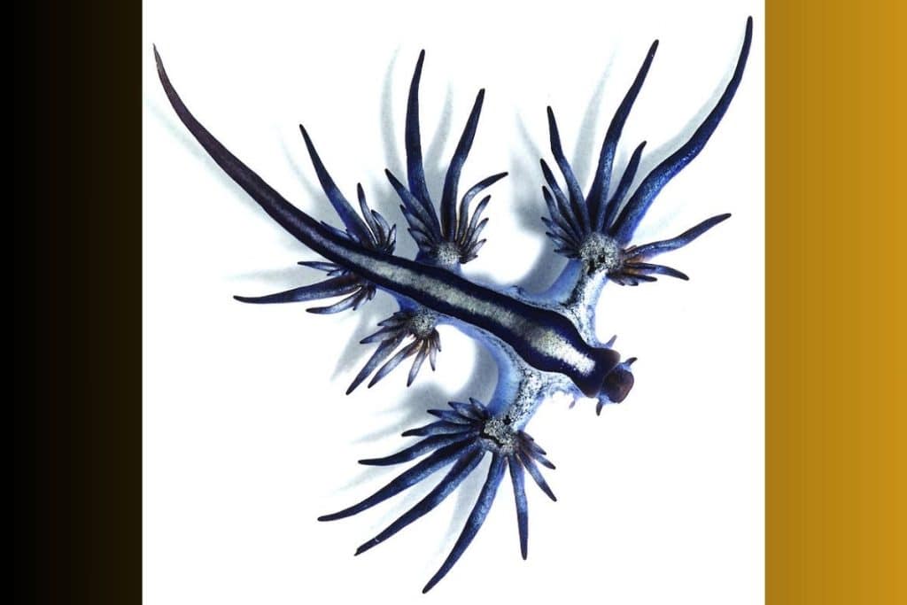 The Glaucus atlanticus, commonly known as the blue dragon, is a small but stunning sea slug. Its bright blue color and wing-like appendages make it look like a tiny dragon floating in the ocean. This creature floats on the surface of the water, feeding on venomous prey like the Portuguese man o’ war and storing the toxins to use for its own defense.