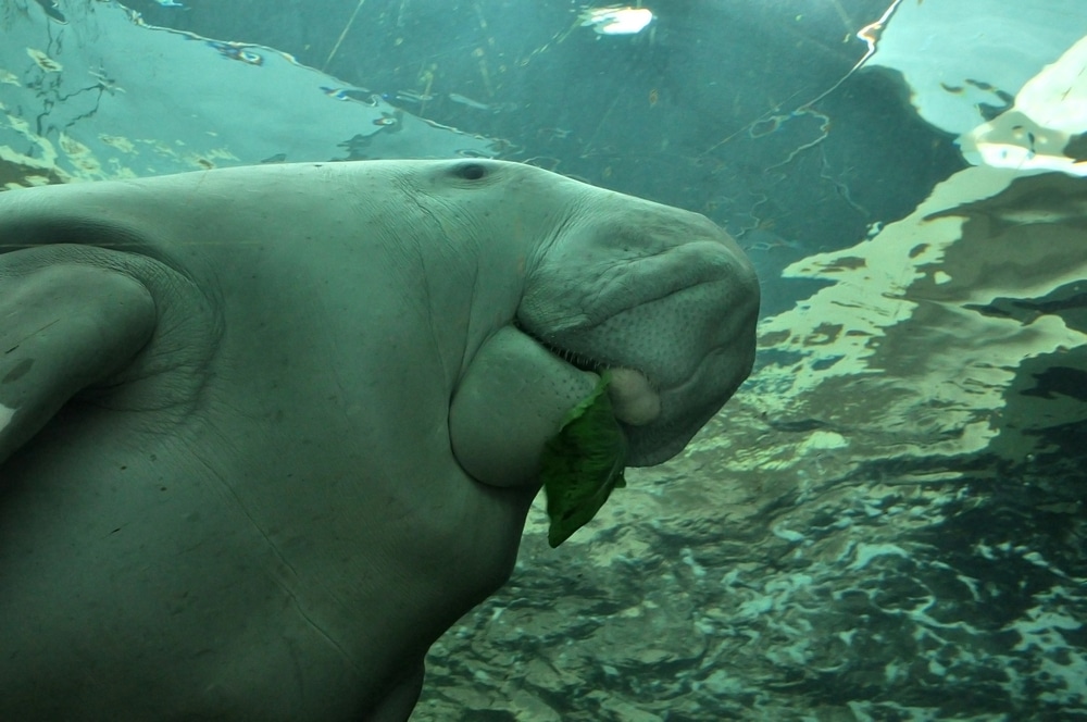 Dugongs are marine mammals that graze on seagrass in coastal waters. Often mistaken for manatees, they have a dolphin-like tail and a more streamlined body. Dugongs are slow-moving and peaceful, spending most of their time feeding. They’re vulnerable to habitat destruction and boat strikes.