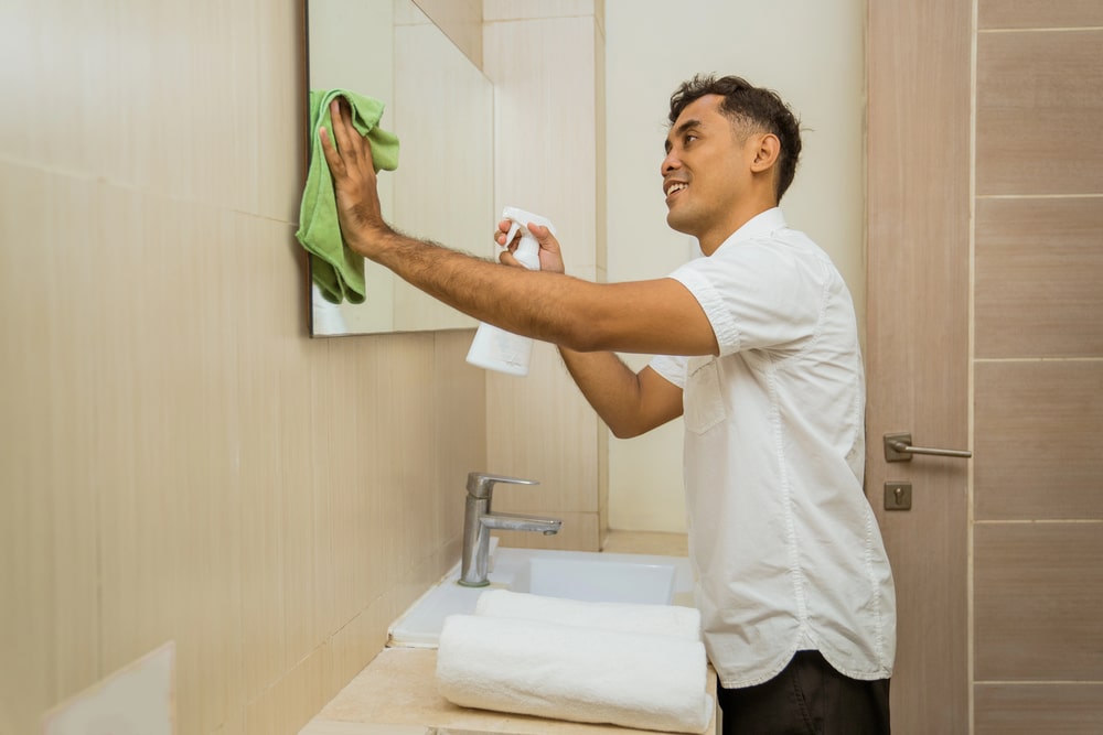 In a spray bottle, mix two cups of water, one tablespoon of white vinegar, and ten drops of tea tree essential oil, which has natural antibacterial properties. Use this disinfectant on surfaces like bathroom counters, door handles, and light switches.