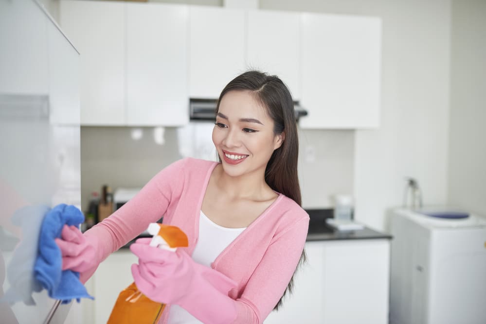 Mix equal parts water and white vinegar in a spray bottle. Spray the solution on shelves and wipe down with a clean cloth. This simple cleaner removes food stains, cuts through grease, and helps keep the fridge smelling fresh.