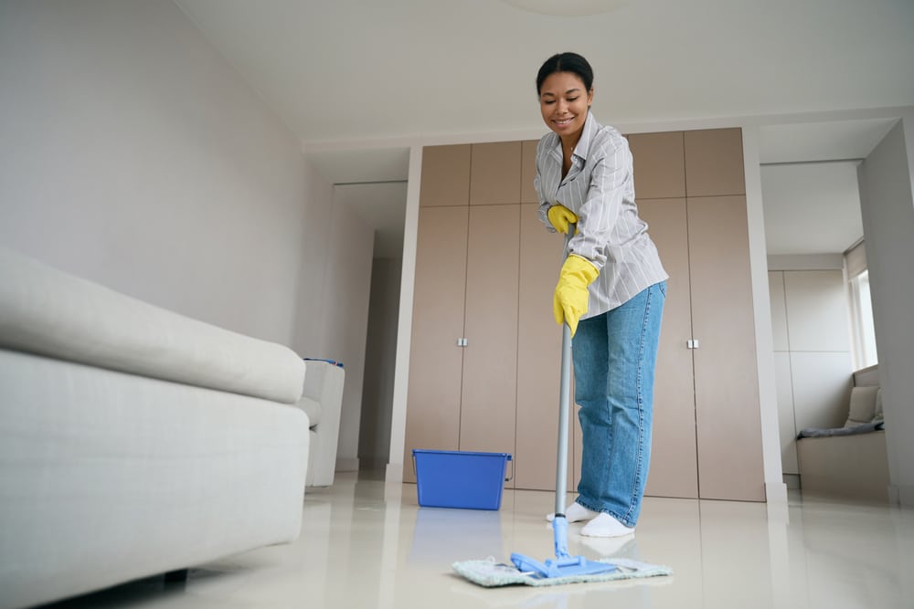 Mix one cup of white vinegar with one gallon of warm water, then add a few drops of essential oil if desired. Use this solution to mop tile or vinyl floors, but avoid using it on wood or stone floors as vinegar can be too harsh.